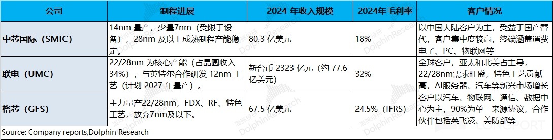 從收入規模看,中芯國際、聯電和格芯的體量相對接近。雖然中芯在制程進展中稍領先於其餘兩家,但毛利率表現明顯低於聯電和格芯。