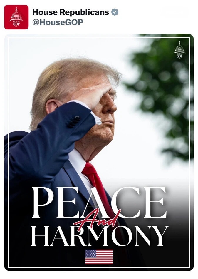 值得一提的是,在發佈了伊以停火協議已達成的消息之後,特朗普還在 Truth Social 平台上發佈了 2 張耐人尋味的圖片:一張是黑白色個人照,其上配文稱「以力量求和平」;另外一張則是白宮辦公室發佈的一張特朗普單手敬禮的照片,配文為「和平&和諧」。