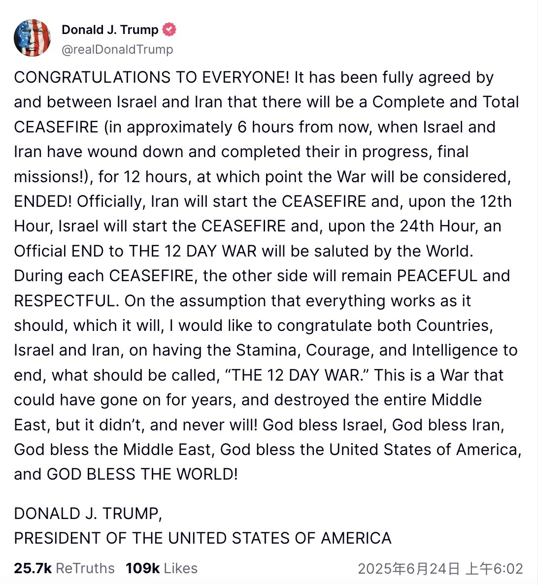 正如我們此前在《美國打擊伊朗核設施,ETH 成為燃料大跌 7%》一文中提到的,特朗普調動軍事力量突襲伊朗核設施,包括 ETH、BTC 在内的加密貨幣成為「戰爭燃料」;而在北京時間 6 月 23 日晚,中東地區緊張局勢進一步升級,伊朗、以色列雙方「互放狠話」,美國也「加入戰局」,中東地區不少國家更是受伊朗攻擊威脅而不得不選擇關閉領空。就在這樣的環境下,特朗普還是充分發揮了自己長袖善舞的功力,結合自己手中的「戰爭權杖」,在短短十個小時左右為伊以沖突暫時踩下了刹車。