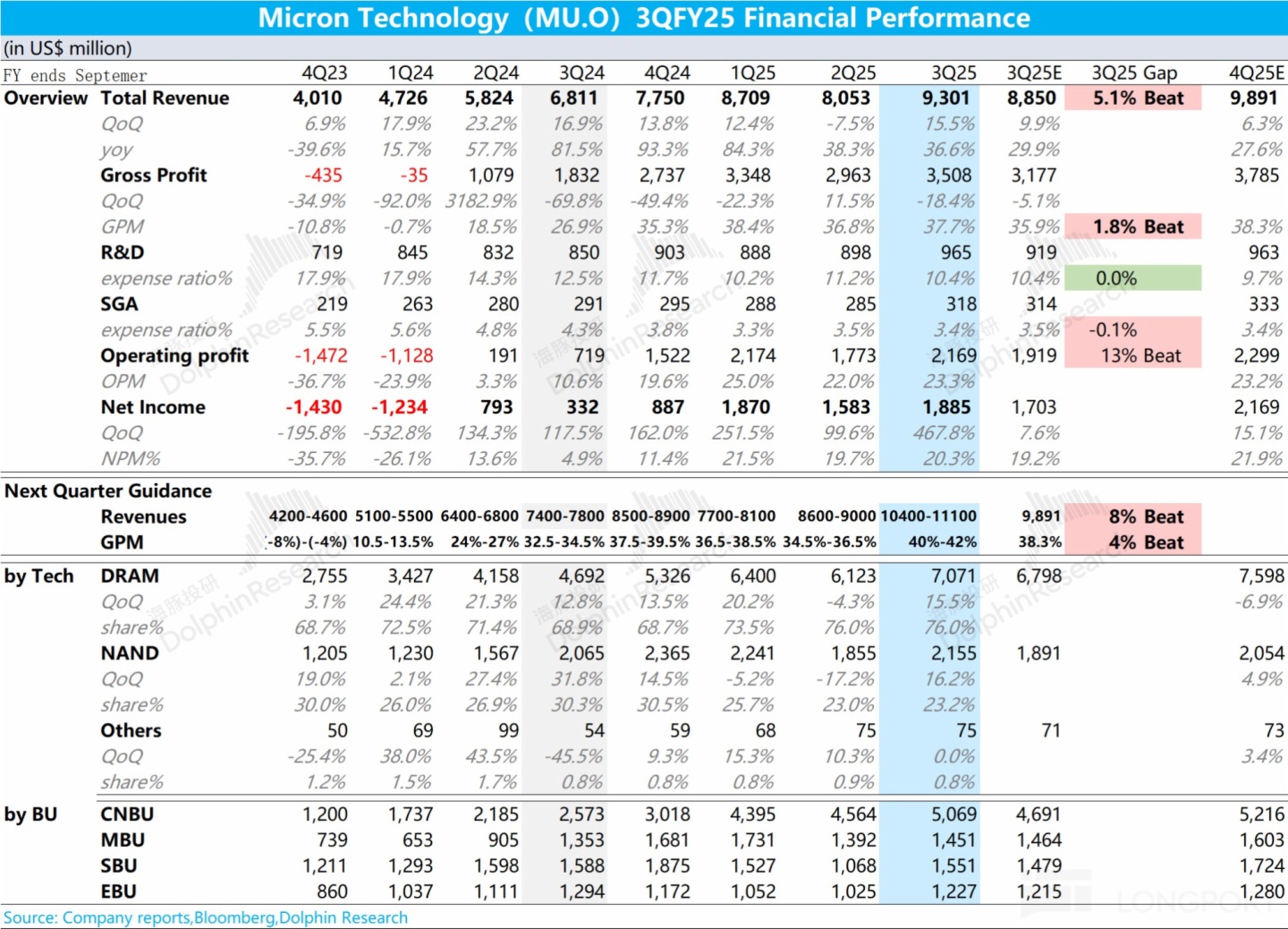 1.整體業績:$美光科技(MU.US) 本季度營收 93 億美元,環比增長 15.5%,好於市場預期(88.5 億美元),預期差主要來自於 NAND 出貨增加和 HBM 增長的帶動。其中本季度 DRAM 和 NAND 的均價仍有回落,但兩項出貨量環比增速都達到了 20% 以上。