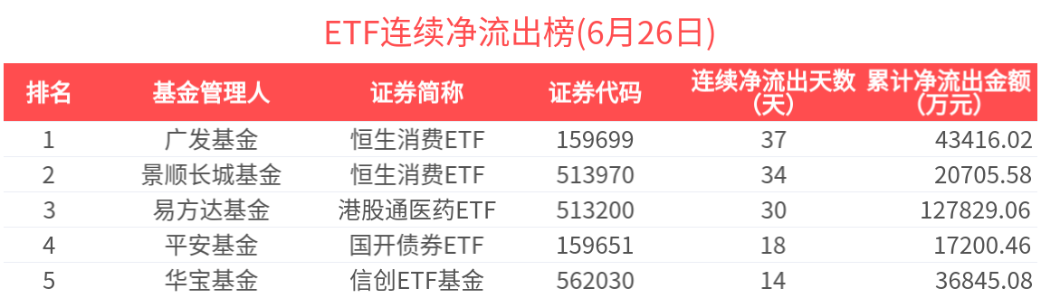 連續淨流出的ETF基金有352只,居前的為恒生消費ETF(37天)、恒生消費ETF(34天)、港股通醫藥ETF(30天)、國開債券ETF(18天)、信創ETF基金(14天),分別淨流出4.34億元、2.07億元、12.78億元、1.72億元、3.68億元。其中,恒生消費ETF近34天加速流出,近34天累計流出2.07億元,基金規模快速下降至16.58億元。