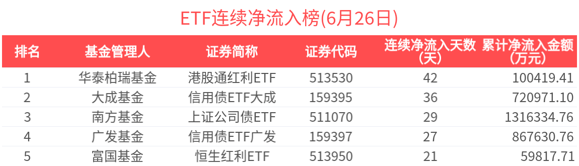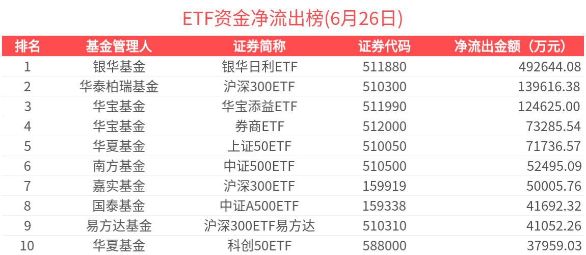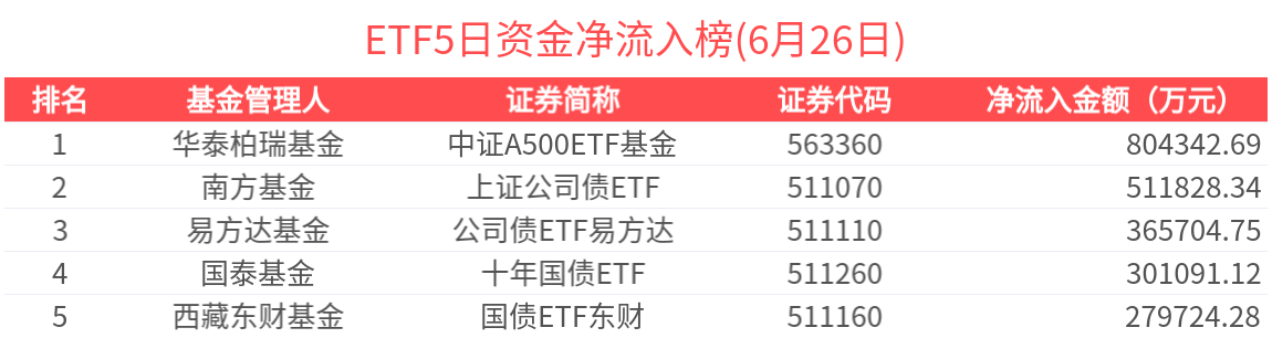 2025年6月26日共206只ETF基金獲資金淨流入,524只ETF基金淨流出。淨流入金額超1億元的有29只,中證A500ETF基金(563360.SH)、短融ETF(511360.SH)、公司債ETF易方達(511110.SH)、可轉債ETF(511380.SH)、國債ETF東財(511160.SH)資金顯著流入,分別淨流入20.48億元、16.68億元、15.92億元、11.82億元、5.00億元(淨申購份額*單位淨值)。