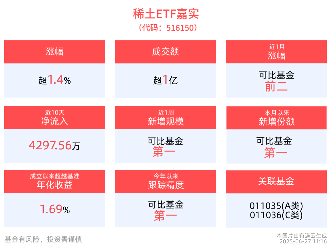 截至2025年6月27日 11:16,中證稀土産業指數強勢上漲1.32%,成分股金田股份上漲6.51%,科力遠上漲6.44%,鉑科新材上漲4.76%,中科磁業、金力永磁等個股跟漲。稀土ETF嘉實(516150)上漲1.48%。
