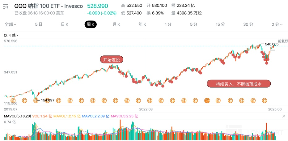 在这种策略下,即使后续市场继续下跌,投资者仍保留充足弹药。而一旦反弹开始,前期积累的碎股将快速转化为可观收益。以$纳指 100 ETF - Invesco(QQQ.US) 为例: