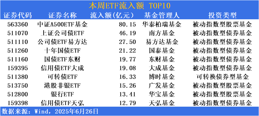 具體資金流入方面,防禦類資産依舊受到青睐,債券、銀行ETF成為流入主力。本期(2025年6月23日-6月26日),除中證A500ETF基金(563360)流入超80億,斷崖式領跑外。其餘2-10名君實防禦類資産。上證公司債債ETF(511070)、公司債ETF易方達(511110)、十年國債ETF(511260)等産品流入超20億。