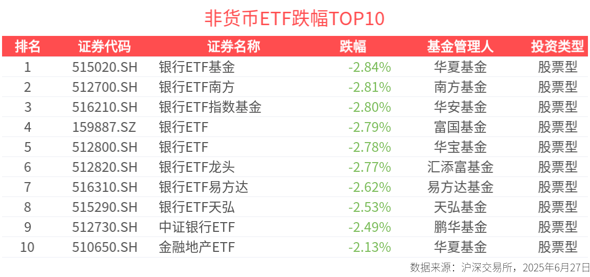 截至今日收盤,全市場共計520只非貨ETF下跌,下跌比例達45%。行業主題指數方面,中證800銀行指數、中證銀行指數跌幅居前,分別下跌2.95%、2.94%。