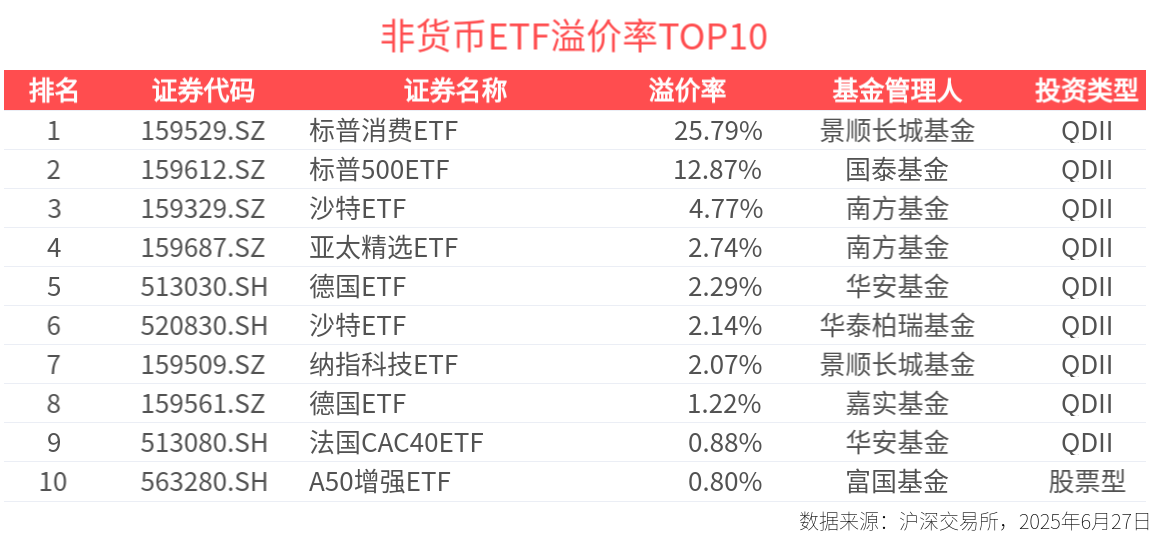 截至今日收盤,標普500消費精選指數溢價居前,標普消費ETF收盤溢價25.79%;標普500指數情緒高漲,標普500ETF收盤溢價12.87%。