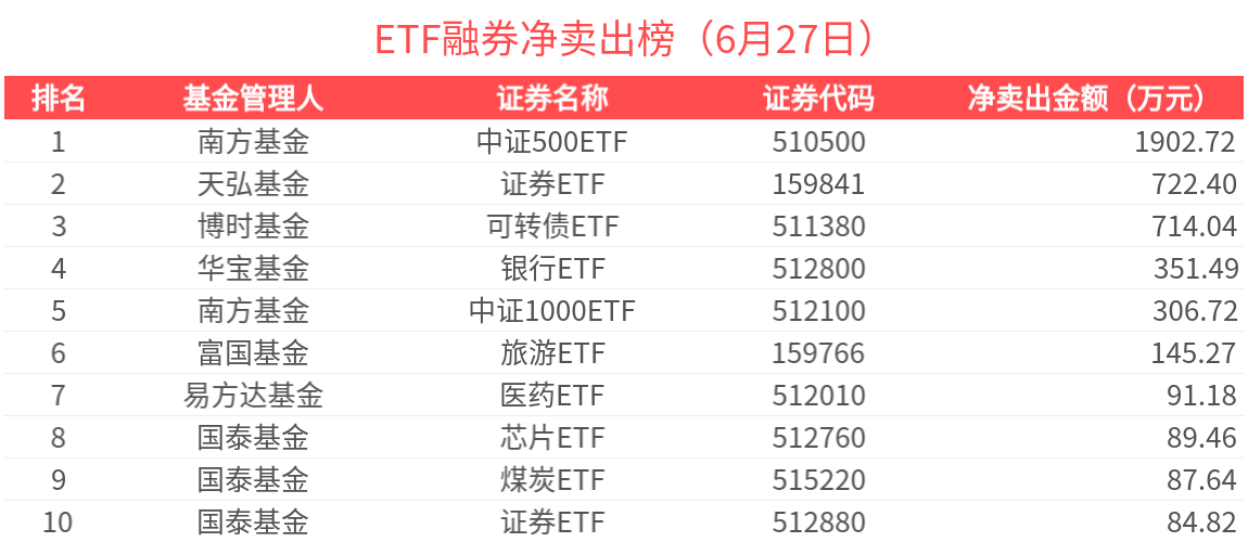 融券淨賣出金額超500萬元的有3只,中證500ETF(510500.SH)、證券ETF(159841.SZ)、可轉債ETF(511380.SH)槓桿資金顯著流出,分別淨流出1902.72萬元、722.40萬元、714.04萬元。