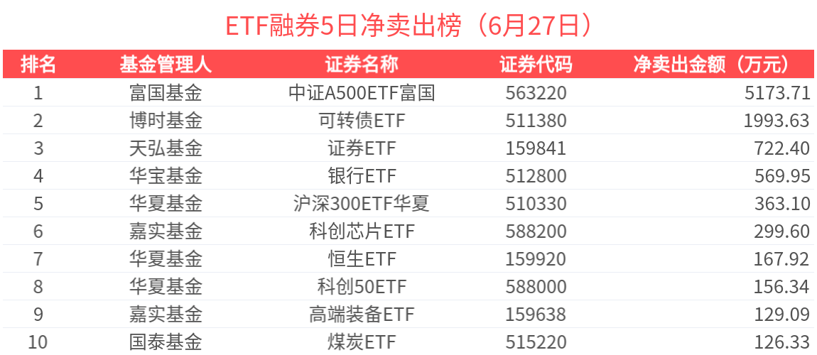 拉長時間看,近5天獲槓桿資金融券淨賣出超過500萬元的有4只,金額居前的為中證A500ETF富國、可轉債ETF、證券ETF、銀行ETF等,分別淨流出5173.71萬元、1993.63萬元、722.40萬元、569.95萬元。其中,中證A500ETF富國近5天獲槓桿資金大幅融券淨賣出,達到成交額的0.85%。