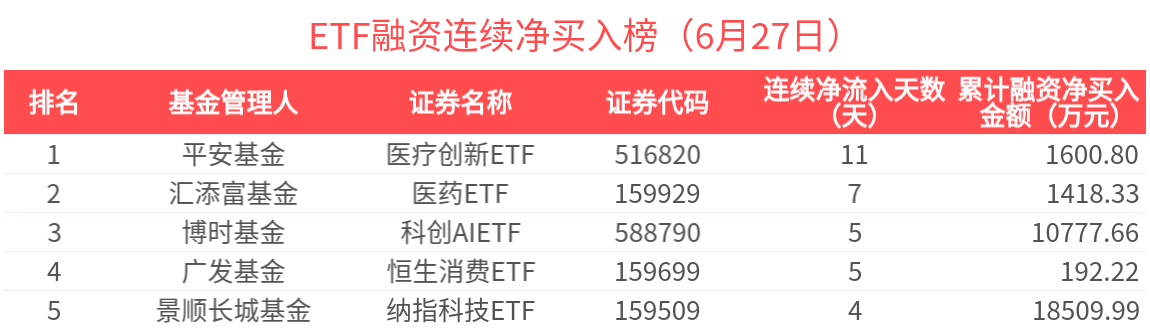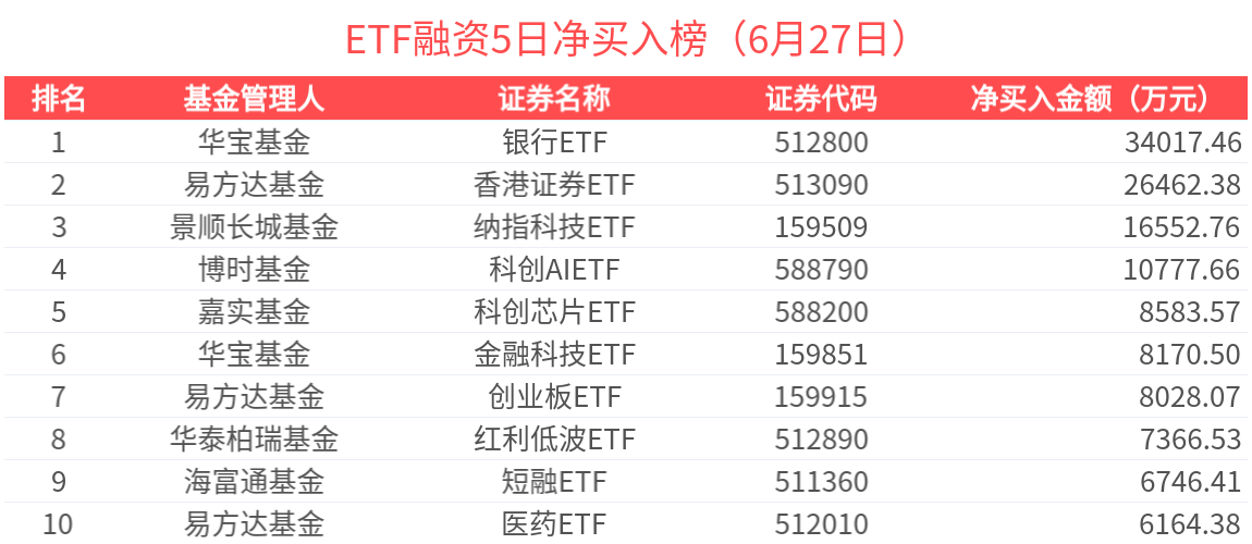 2025年6月27日,共170只ETF基金獲融資淨買入,34只ETF基金融券淨賣出。融資淨買入金額超500萬元的有29只,銀行ETF(512800.SH)、納指科技ETF(159509.SZ)、紅利低波ETF(512890.SH)、紅利ETF(510880.SH)、可轉債ETF(511380.SH)槓桿資金顯著流入,分別淨流入2.25億元、1.20億元、5528.51萬元、3090.21萬元、2539.85萬元。