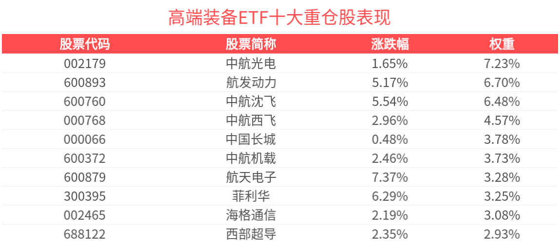數據顯示,截至2025年5月30日,中證高端裝備細分50指數前十大權重股分別為中航沈飛、中航光電、航發動力、中航西飛、中國長城、中航機載、海格通信、航天電子、菲利華、中航成飛,前十大權重股合計佔比45.86%。