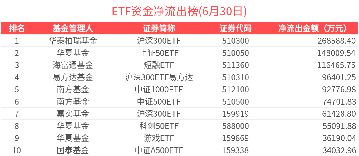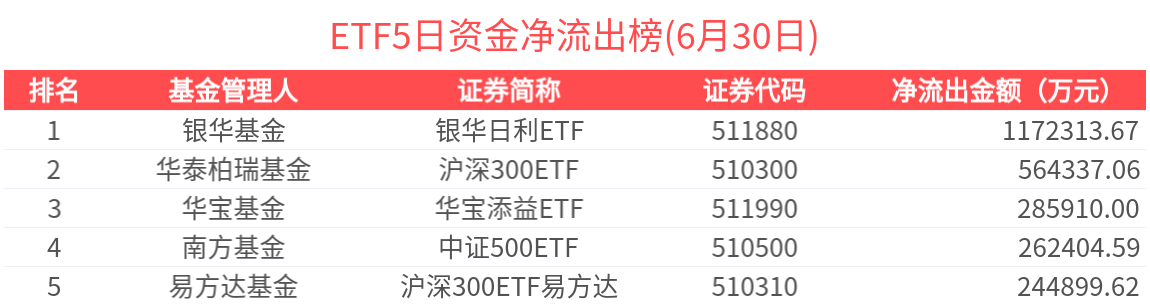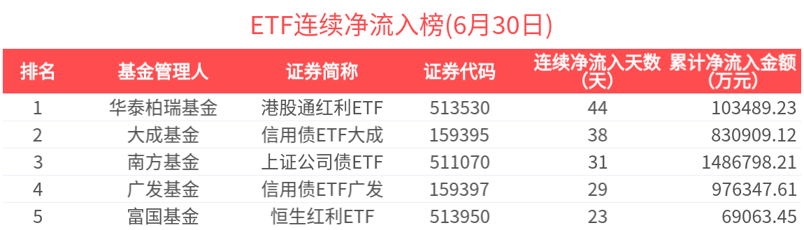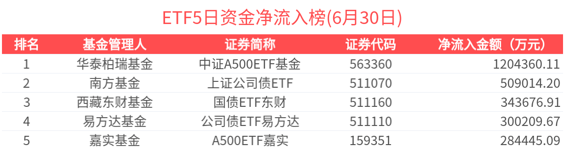 2025年6月30日共241只ETF基金獲資金淨流入,503只ETF基金淨流出。淨流入金額超1億元的有48只,中證A500ETF基金(563360.SH)、中證A500ETF南方(159352.SZ)、上證公司債ETF(511070.SH)、A500ETF嘉實(159351.SZ)、信用債ETF大成(159395.SZ)資金顯著流入,分別淨流入22.45億元、16.54億元、11.30億元、10.58億元、9.92億元(淨申購份額*單位淨值)。