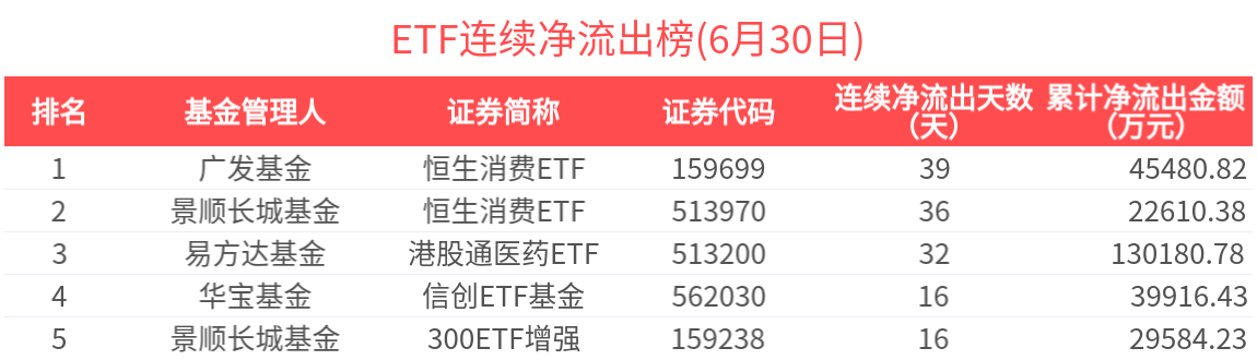 連續淨流出的ETF基金有321只,居前的為恒生消費ETF(39天)、恒生消費ETF(36天)、港股通醫藥ETF(32天)、信創ETF基金(16天)、300ETF增強(16天),分別淨流出4.55億元、2.26億元、13.02億元、3.99億元、2.96億元。其中,恒生消費ETF近36天加速流出,近36天累計流出2.26億元,基金規模快速下降至16.53億元。