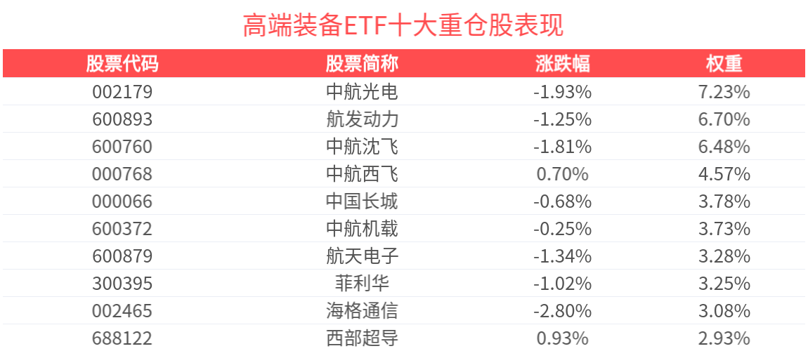 數據顯示,截至2025年6月30日,中證高端裝備細分50指數前十大權重股分別為中航沈飛、航發動力、中航光電、中航西飛、中航機載、中國長城、海格通信、航天電子、中航成飛、西部超導,前十大權重股合計佔比45.22%。