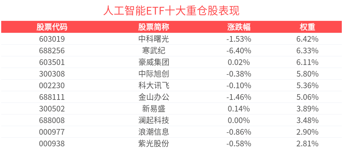 數據顯示,截至2025年6月30日,中證人工智能産業指數(931071)前十大權重股分別為中際旭創(300308)、新易盛(300502)、科大訊飛(002230)、豪威集團(603501)、中科曙光(603019)、金山辦公(688111)、寒武紀(688256)、瀾起科技(688008)、浪潮信息(000977)、海康威視(002415),前十大權重股合計佔比52.07%。