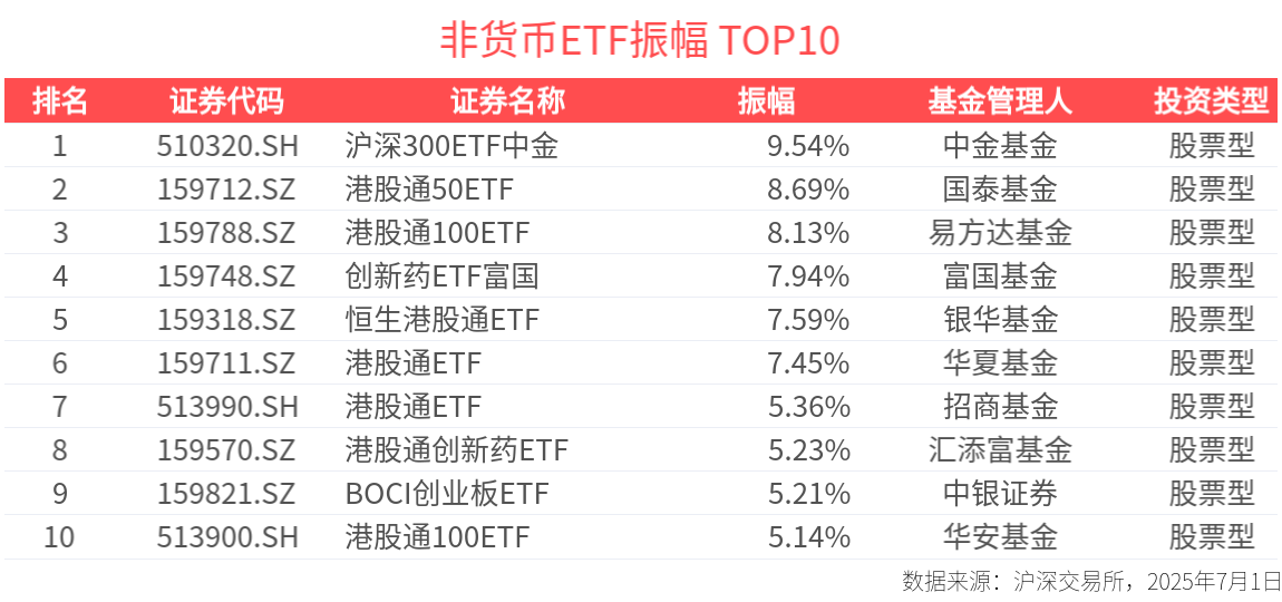 截至今日收盤,滬深300ETF中金、港股通50ETF、港股通100ETF振幅居市場前列,分別達9.54%、8.69%、8.13%。