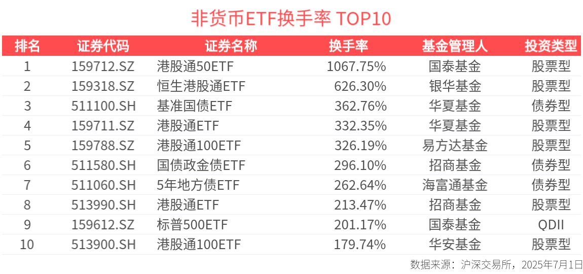 ETF熱門榜:中證短融相關ETF成交居前,港股通50ETF(159712.SZ)交易活躍-20250701