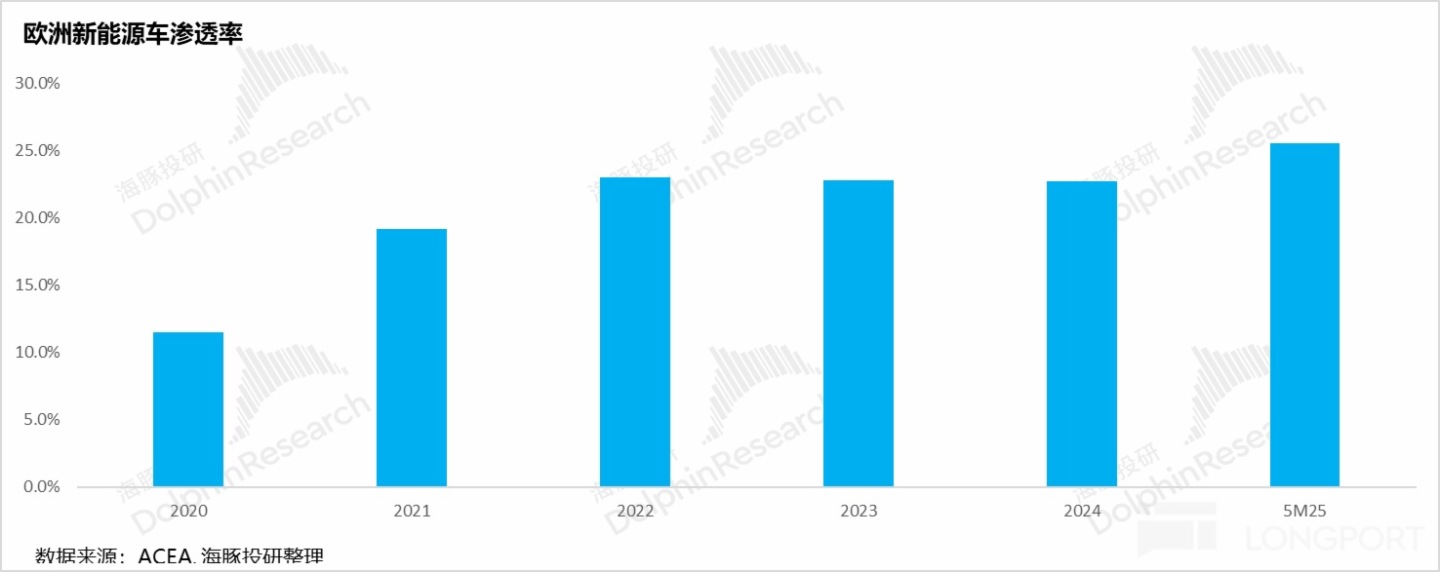 從歐洲新能源汽車滲透率來看,2025 年 1-5 月歐洲市佔率呈現相對明顯的提升趨勢,從 2024 年 23% 提升到 2025 年 1-5 年 25.5%,而 5 月單月的新能源車滲透率達到了 27%。