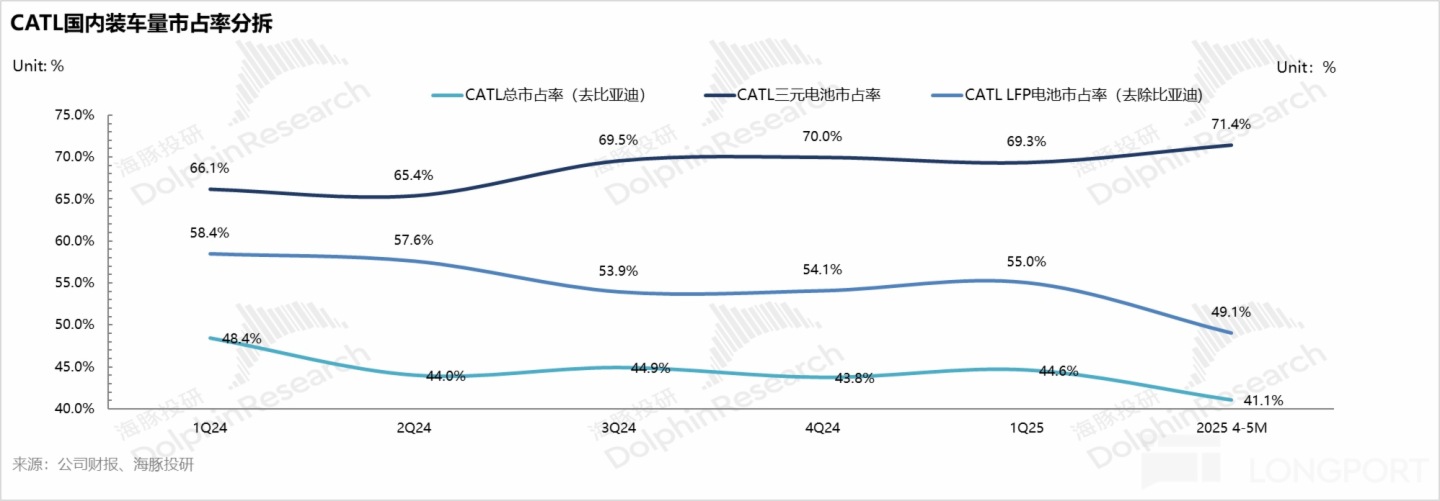 但從寧王自身在國内的市佔率趨勢來看(去比亞迪計算,主要自供為主),寧王在國内的市佔率仍然呈現持續的下行趨勢,而下行的根本原因仍在於 LFP 電池的市佔率持續下滑。