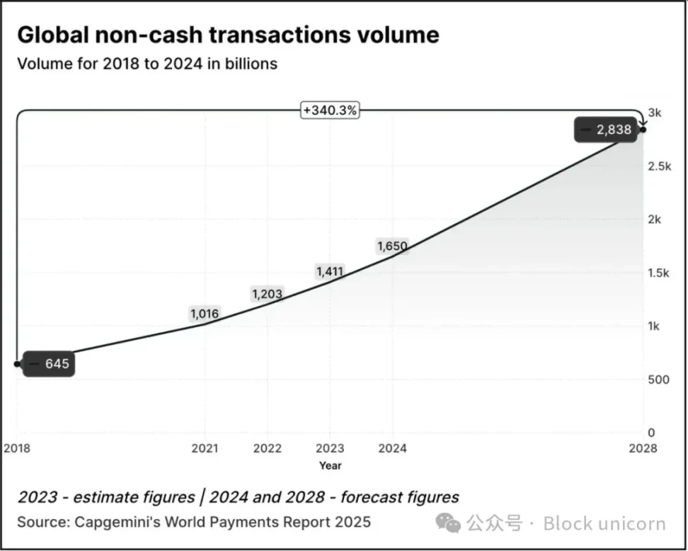 交易量從 2018 年的 6450 億增長到 2024 年的 1.65 萬億,增長了 2.5 倍。根據 Capgemini 的《2025 年世界支付報告》,預計到 2028 年,交易量將從 2024 年的水平增長 70%,達到 2.84 萬億。