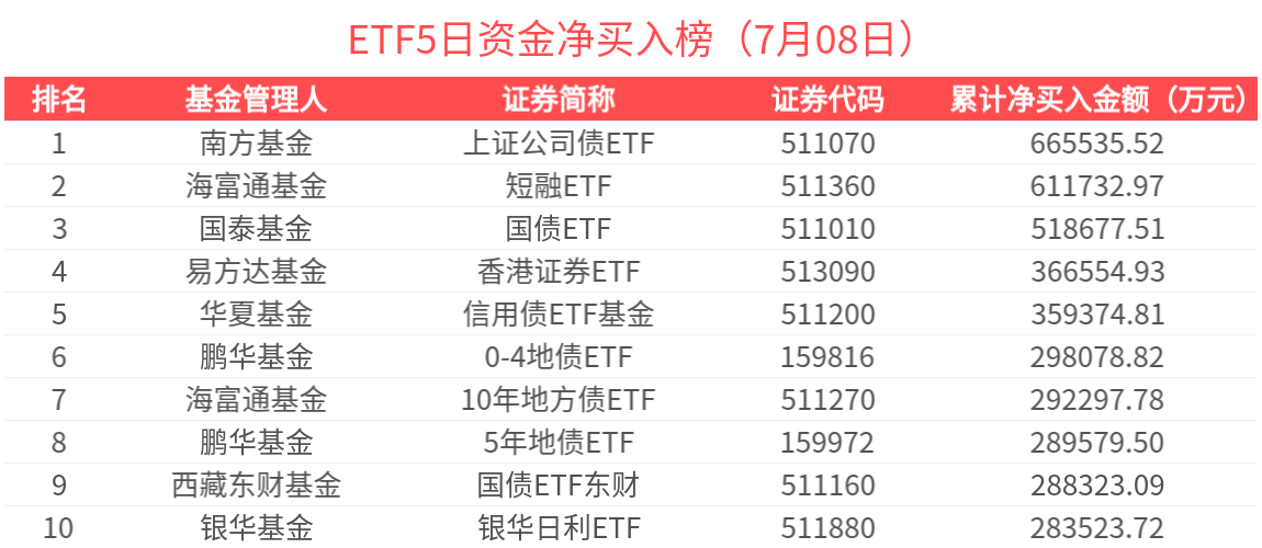 拉長時間看,近5天主力資金累計淨買入超過1億元的ETF基金有62只,金額居前的為上證公司債ETF(511070), 短融ETF(511360), 國債ETF(511010), 香港證券ETF(513090), 信用債ETF基金(511200)分別淨買入66.55億元, 61.17億元, 51.87億元, 36.66億元, 35.94億元。其中,上證公司債ETF近5天獲主力資金大幅淨買入。