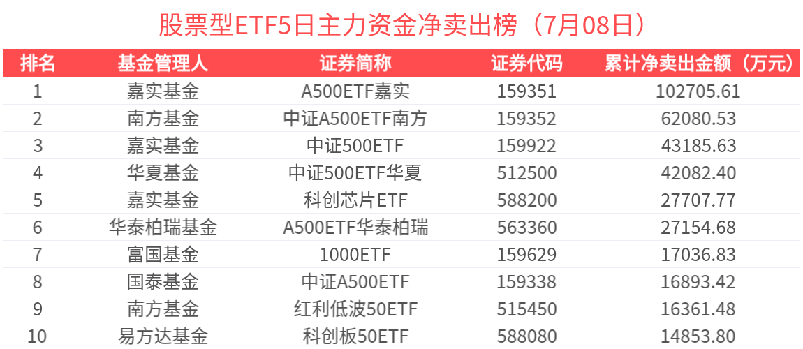 近5天主力資金累計淨賣出超過1億元的股票型ETF基金有13只,金額居前的為A500ETF嘉實(159351), 中證A500ETF南方(159352), 中證500ETF(159922), 中證500ETF華夏(512500), 科創芯片ETF(588200)分別淨賣出10.27億元, 6.21億元, 4.32億元, 4.21億元, 2.77億元。其中,A500ETF嘉實近5天遭主力資金大幅淨賣出。