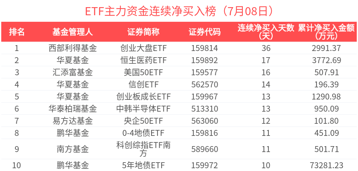 近期主力資金連續淨買入的ETF基金有196只,居前的為創業大盤ETF(36天), 恒生醫藥ETF(17天), 美國50ETF(16天), 信創ETF(14天), 創業板成長ETF(13天)分別淨買入4.51億元, 11.99億元, 4081.55萬元, 1.42億元, 2.39億元。其中,上證公司債ETF近8天獲主力資金加速買入,近8天累計買入148.37億元。