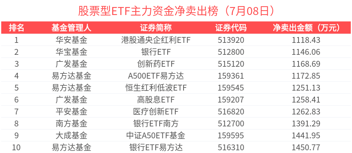 其中,主力資金淨賣出金額超1千萬元的股票型ETF基金有29只,港股通央企紅利ETF(513920), 銀行ETF(512800), 創新藥ETF(515120), A500ETF易方達(159361), 恒生紅利低波ETF(159545)遭主力資金抛棄,分別淨賣出0.11億元, 0.11億元, 0.12億元, 0.12億元, 0.13億元。