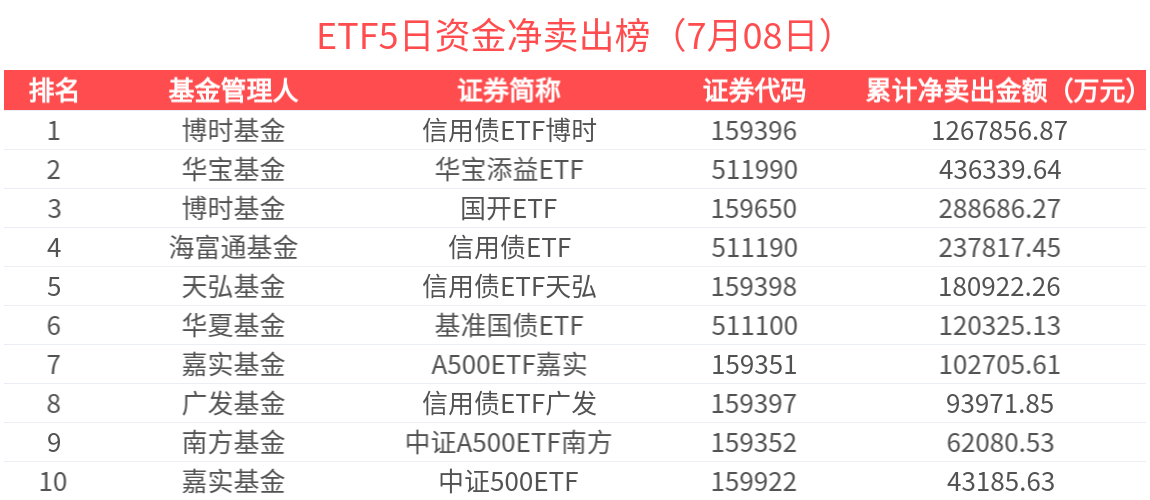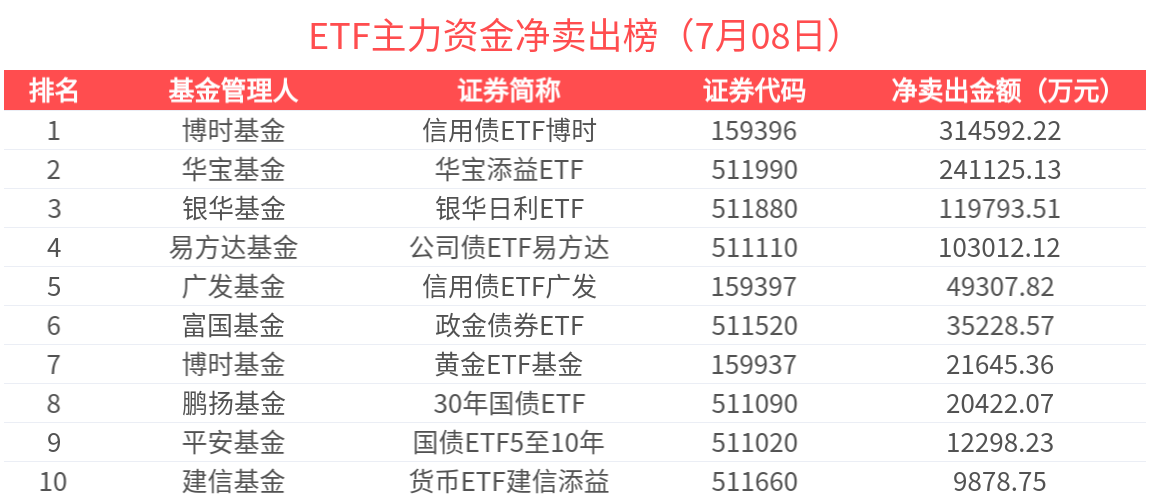 主力資金淨賣出金額超1千萬元的ETF基金有53只,信用債ETF博時(159396), 華寶添益ETF(511990), 銀華日利ETF(511880), 公司債ETF易方達(511110), 信用債ETF廣發(159397)遭主力資金抛棄,分別淨賣出31.46億元, 24.11億元, 11.98億元, 10.30億元, 4.93億元。