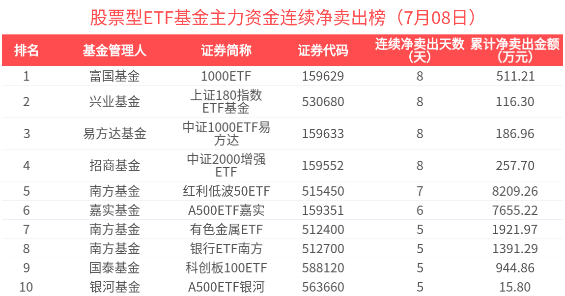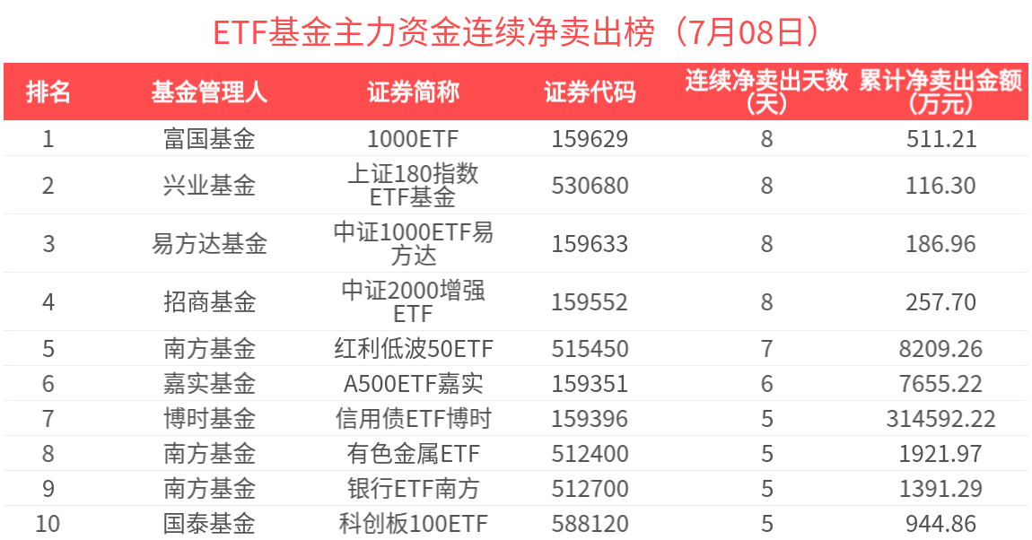 近期主力資金連續淨賣出的ETF基金有89只,居前的為1000ETF(8天), 上證180指數ETF基金(8天), 中證1000ETF易方達(8天), 中證2000增強ETF(8天), 紅利低波50ETF(7天)分別淨賣出4.70億元, 4188.93萬元, 3696.65萬元, 1739.41萬元, 2.52億元。其中,信用債ETF博時近5天遭主力資金加速賣出,近5天累計賣出126.79億元。