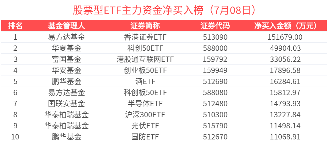 其中,主力資金淨買入金額超1千萬元的股票型ETF基金有106只,香港證券ETF(513090), 科創50ETF(588000), 港股通互聯網ETF(159792), 創業板50ETF(159949), 酒ETF(512690)受到主力資金青睐,分別獲淨買入15.17億元, 4.99億元, 3.31億元, 1.79億元, 1.63億元。