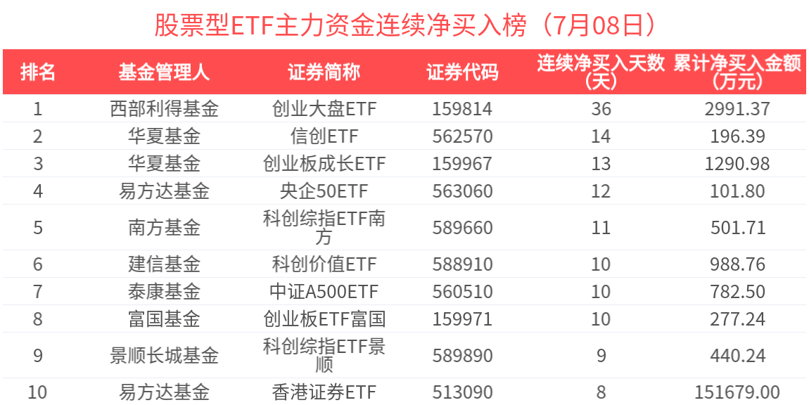 近期主力資金連續淨買入的股票型ETF基金有139只,居前的為創業大盤ETF(36天), 信創ETF(14天), 創業板成長ETF(13天), 央企50ETF(12天), 科創綜指ETF南方(11天)分別淨買入4.51億元, 1.42億元, 2.39億元, 8381.55萬元, 8226.31萬元。其中,香港證券ETF近8天獲主力資金加速買入,近8天累計買入46.51億元。