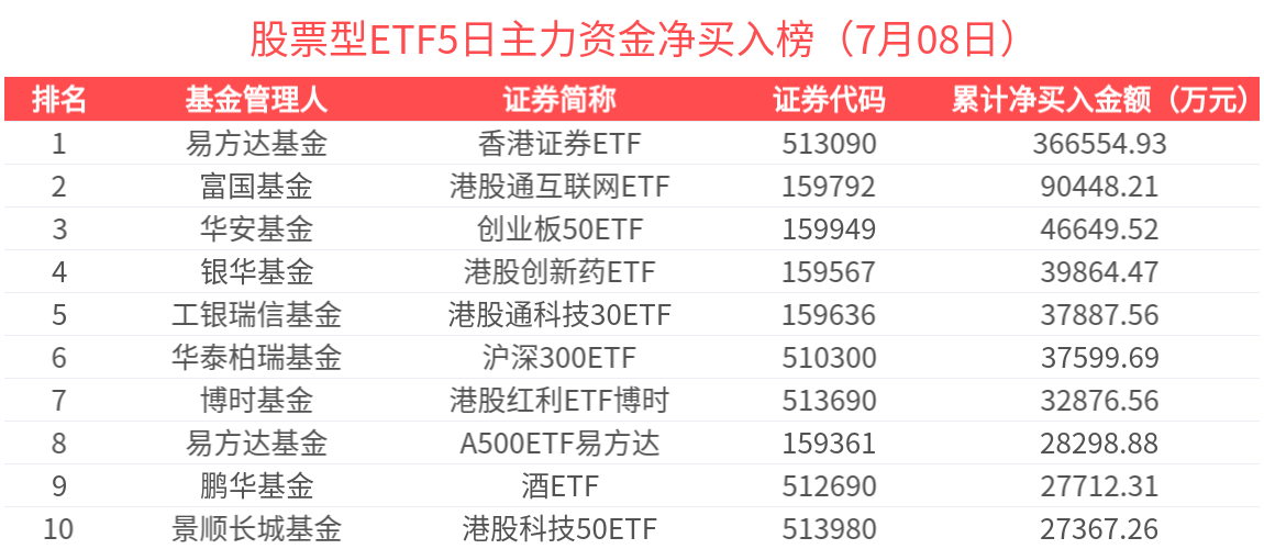 近5天主力資金累計淨買入超過1億元的股票型ETF基金有27只,金額居前的為香港證券ETF(513090), 港股通互聯網ETF(159792), 創業板50ETF(159949), 港股創新藥ETF(159567), 港股通科技30ETF(159636)分別淨買入36.66億元, 9.04億元, 4.66億元, 3.99億元, 3.79億元。其中,香港證券ETF近5天獲主力資金大幅淨買入。