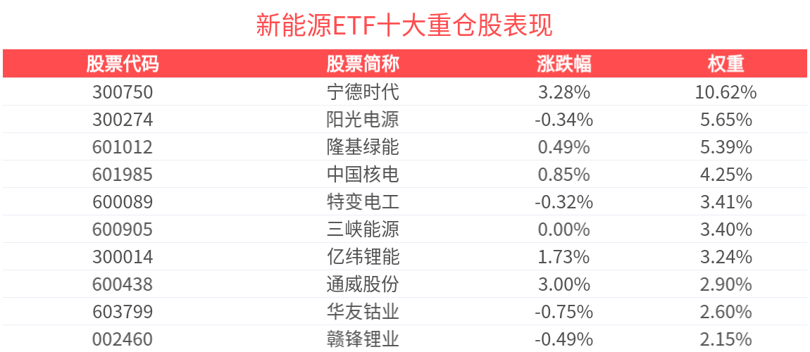 數據顯示,截至2025年6月30日,中證新能源指數前十大權重股分別為寧德時代、陽光電源、隆基綠能、中國核電、三峽能源、特變電工、億緯鋰能、華友钴業、通威股份、贛鋒鋰業,前十大權重股合計佔比42.81%。