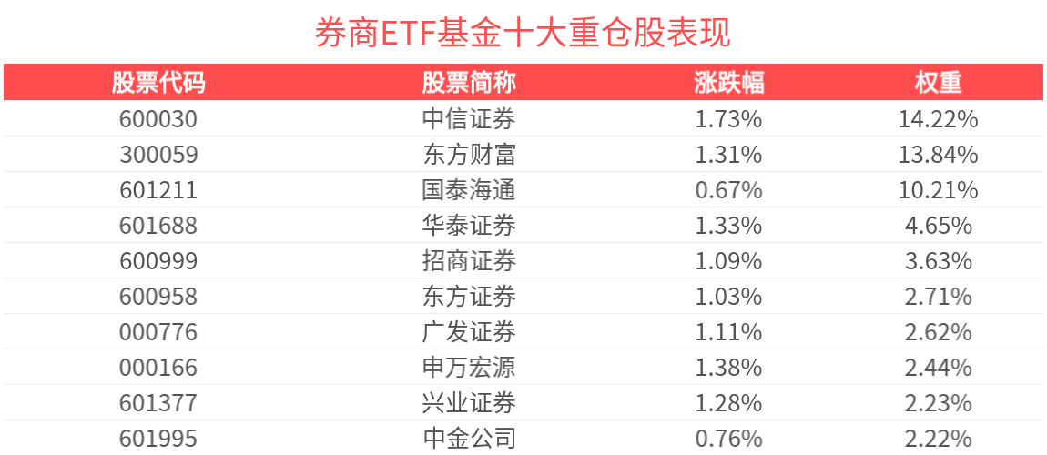 券商ETF基金緊密跟蹤中證全指證券公司指數,截至2025年6月30日,指數前十大權重股分別為東方財富、中信證券、國泰海通、華泰證券、招商證券、東方證券、廣發證券、申萬宏源、興業證券、中金公司,前十大權重股合計佔比60.45%。