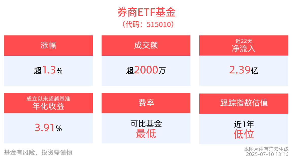 截至2025年7月10日 13:16,中證全指證券公司指數(399975)強勢上漲1.34%,成分股中銀證券(601696)上漲10.03%,紅塔證券(601236)上漲6.09%,東北證券(000686)上漲2.71%,華林證券(002945),東吳證券(601555)等個股跟漲。券商ETF基金(515010)上漲1.38%,最新價報1.32元。拉長時間看,截至2025年7月9日,券商ETF基金近1周累計上漲1.40%。