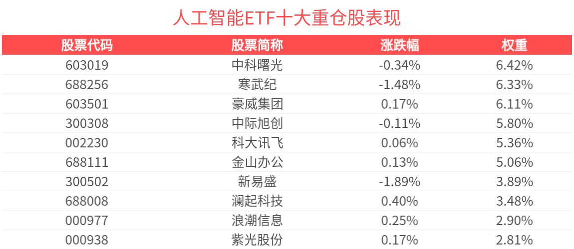 數據顯示,截至2025年6月30日,中證人工智能産業指數(931071)前十大權重股分別為中際旭創(300308)、新易盛(300502)、科大訊飛(002230)、豪威集團(603501)、中科曙光(603019)、金山辦公(688111)、寒武紀(688256)、瀾起科技(688008)、浪潮信息(000977)、海康威視(002415),前十大權重股合計佔比52.07%。