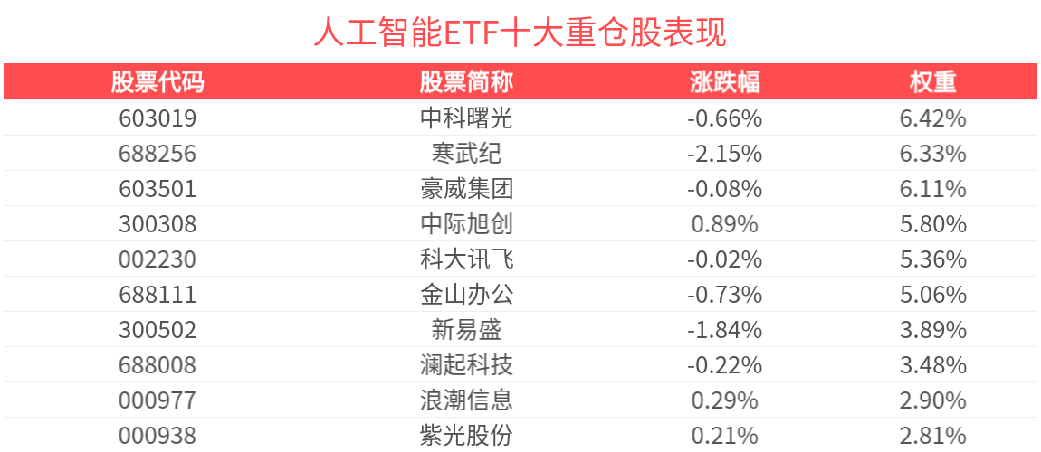 數據顯示,截至2025年6月30日,中證人工智能産業指數(931071)前十大權重股分別為中際旭創(300308)、新易盛(300502)、科大訊飛(002230)、豪威集團(603501)、中科曙光(603019)、金山辦公(688111)、寒武紀(688256)、瀾起科技(688008)、浪潮信息(000977)、海康威視(002415),前十大權重股合計佔比52.07%。