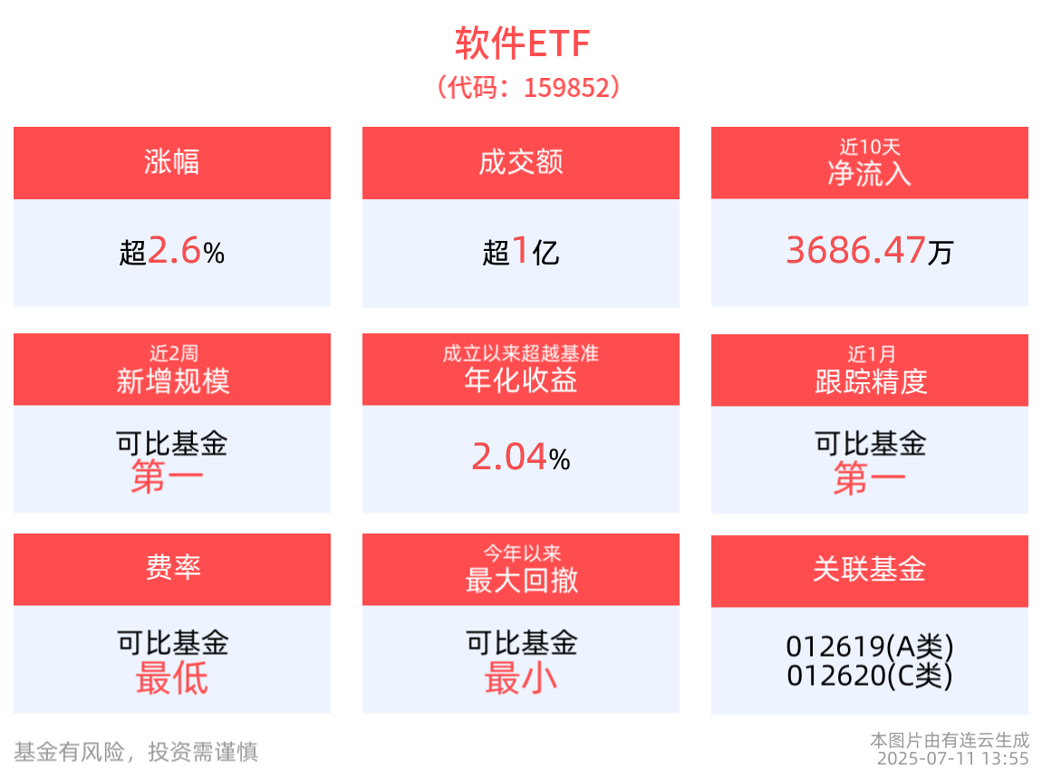 截至7月10日,軟件ETF近1年淨值上漲55.58%,指數股票型基金排名146/2908,居於前5.02%。從收益能力看,截至2025年7月10日,軟件ETF自成立以來,最高單月回報為39.35%,最長連漲月數為3個月,最長連漲漲幅為69.40%,上漲月份平均收益率為9.98%。