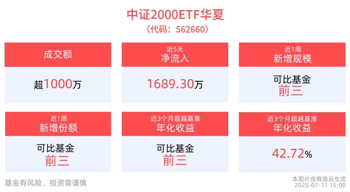 截至2025年7月11日 收盤,中證2000指數(932000)上漲0.48%,成分股三川智慧、古鳌科技、久吾高科、浩歐博漲停,益方生物上漲18.04%。中證2000ETF華夏(562660)上漲0.63%,最新價報1.44元。拉長時間看,截至2025年7月10日,中證2000ETF華夏近1周累計上漲0.99%。