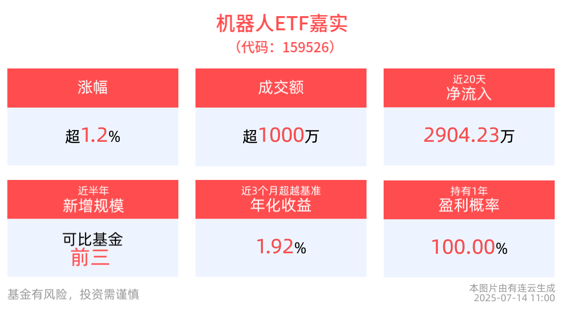 截至2025年7月14日 11:00,中證機器人指數強勢上漲1.12%,成分股科沃斯、中大力德10cm漲停,石頭科技上漲8.64%,新時達、瑞松科技等個股跟漲。機器人ETF嘉實(159526)上漲1.22%。