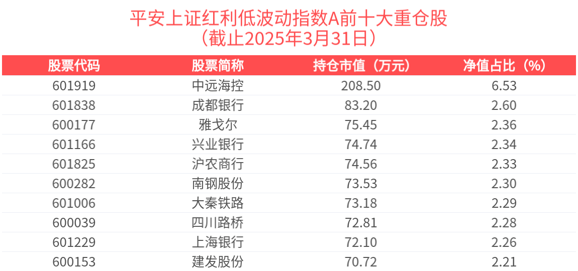 平安上證紅利低波動指數A緊密跟蹤上紅低波指數,上證紅利低波動指數選取50只流動性好、連續分紅、紅利支付率適中、每股股息正增長以及股息率高且波動率低的證券作為指數樣本,採用股息率加權,以反映分紅水平高且波動率低的證券的整體表現。 截止2025年3月31日,平安上證紅利低波動指數A指數基金前十大重倉股分別為中遠海控、成都銀行、雅戈爾、興業銀行、滬農商行等,前十大權重股合計佔比27.50%。