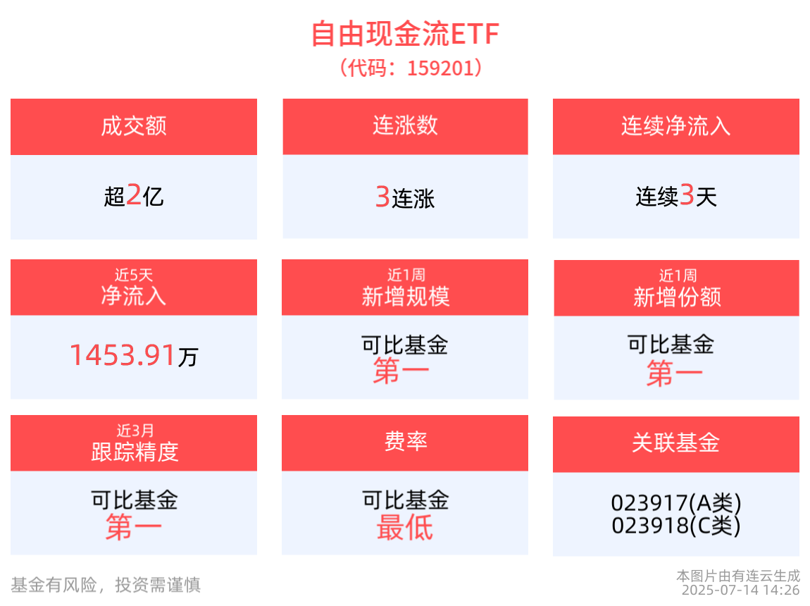 流動性方面,自由現金流ETF盤中換手7.23%,成交2.63億元。拉長時間看,截至7月11日,自由現金流ETF近1年日均成交2.94億元,排名可比基金第一。