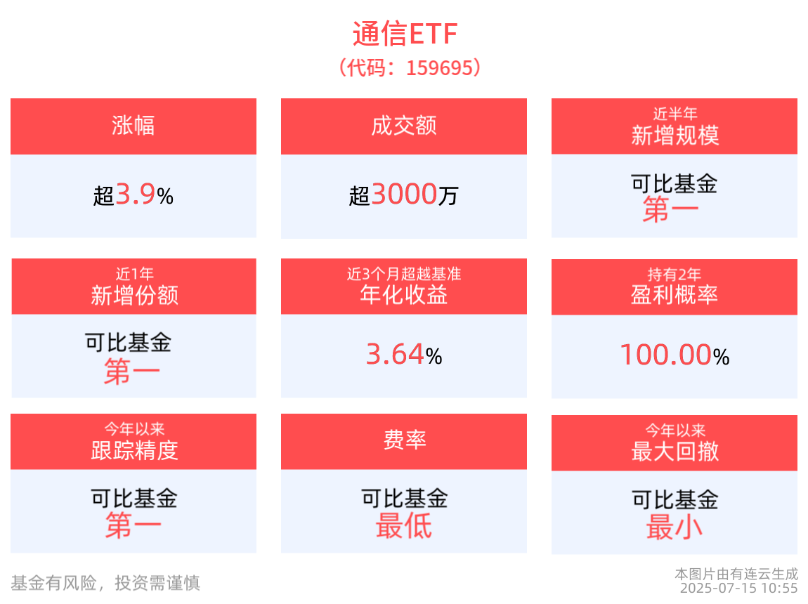 截至2025年7月15日 10:55,國證通信指數(399389)強勢上漲3.84%,成分股新易盛20cm漲停,中際旭創上漲13.56%,仕佳光子上漲13.37%,天孚通信、太辰光等個股跟漲。通信ETF(159695)上漲3.93%。