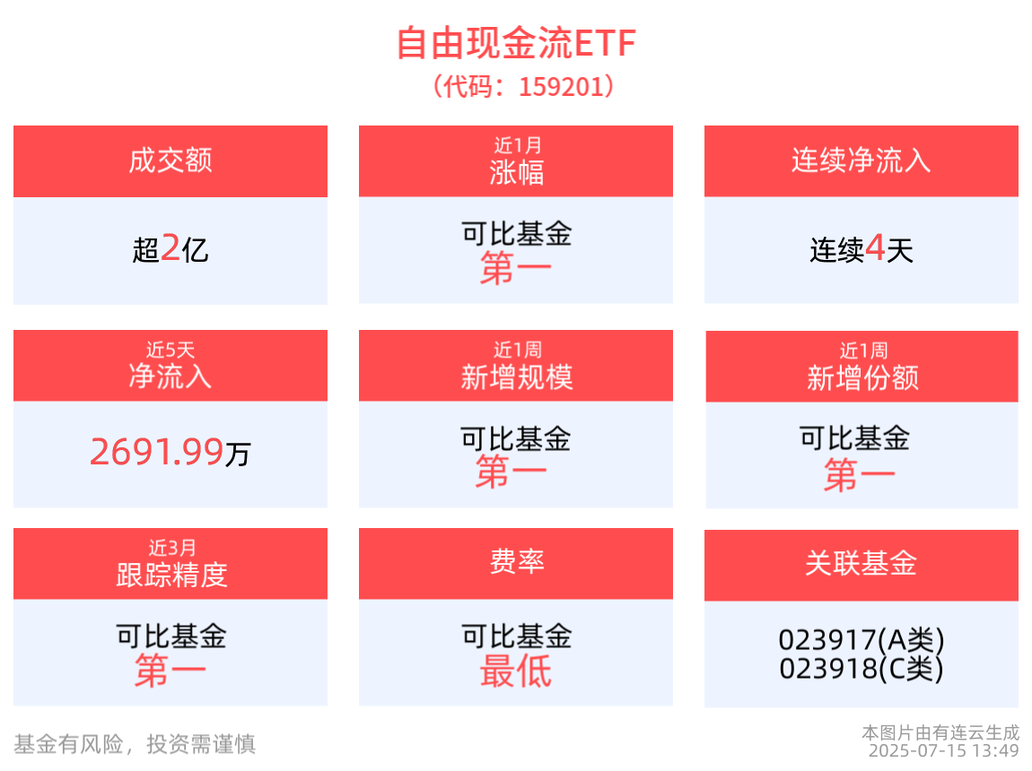 流動性方面,自由現金流ETF盤中換手7.44%,成交2.71億元。拉長時間看,截至7月14日,自由現金流ETF近1年日均成交2.94億元,居可比基金第一。