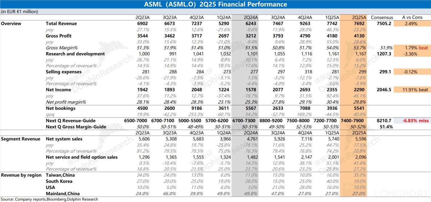 1、收入&毛利率:a)本季度收入 77 億歐元,同比增長 23.2%,市場預期(75 億歐元)。同比增長來源於,公司本季度確認了 1 台 High NA EUV 的收入以及安裝升級服務收入的提升。b)本季度毛利率 53.7%,超公司指引(50-52%),主要是服務類佔比提升,對整體毛利率有結構性提振的影響,以及關稅的負面影響也弱於預期。