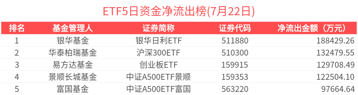 淨流出金額超1億元的有37只,銀華日利ETF(511880.SH)、科創芯片ETF(588200.SH)、中證A500ETF景順(159353.SZ)、短融ETF(511360.SH)、黃金ETF(518880.SH)資金顯著流出,分別淨流出19.28億元、7.79億元、5.97億元、4.63億元、4.27億元(淨贖回份額*單位淨值)。