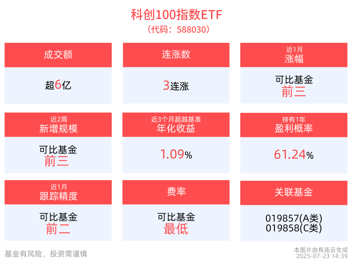 流動性方面,科創100指數ETF盤中換手9.49%,成交6.05億元。拉長時間看,截至7月22日,科創100指數ETF近1年日均成交3.97億元,排名可比基金第一。