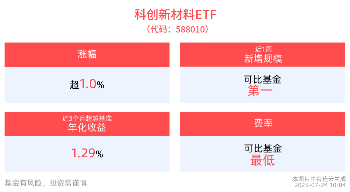 截至2025年7月24日 10:04,上證科創板新材料指數(000689)強勢上漲1.18%,成分股統聯精密(688210)上漲8.74%,雲路股份(688190)上漲6.02%,西部超導(688122)上漲3.37%,航材股份(688563),南亞新材(688519)等個股跟漲。科創新材料ETF(588010)上漲1.08%,最新價報0.65元。拉長時間看,截至2025年7月23日,科創新材料ETF近1周累計上漲2.54%。