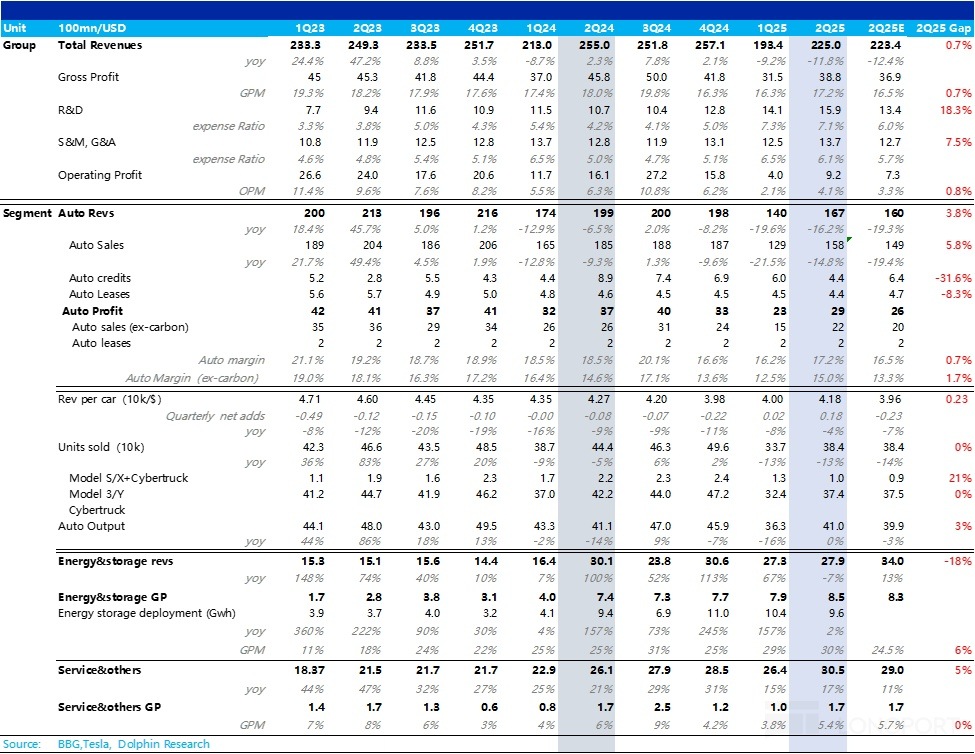 本季度總收入端225億,實際表現不錯,超出海豚君看到的223億左右的大行預期,雖然儲能業務表現一般,但由於關稅影響實則已經很大程度上被市場price in(BBG預期比較老舊),而真正表現比較亮眼的是賣車收入上,終於在持續幾個季度miss市場預期後,由於Model Y Juniper的換新版上市漲價,有了一次超預期的表現。